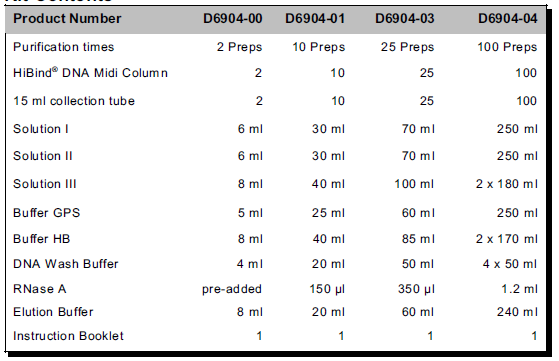 該試劑盒采用經(jīng)典的SDS堿裂解法和中量硅膠柱純化方式,適合于從25-50ml培養(yǎng)過夜的細(xì)菌培養(yǎng)液中純化高達(dá)250µg質(zhì)粒DNA。純化的質(zhì)??芍苯佑糜谧詣?dòng)測(cè)序、酶切、轉(zhuǎn)錄等各種用途。質(zhì)粒的產(chǎn)量依賴于質(zhì)粒的拷貝數(shù)、E.coli 菌株以及生長條件,一般30ml攜帶高拷貝質(zhì)粒的E.coli LB過夜培養(yǎng)液可以純化出100-250µg質(zhì)粒DNA,對(duì)于低拷貝菌株一次操作量可以高達(dá)100mL。