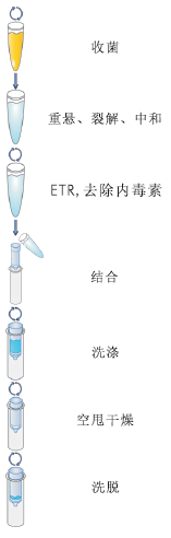 內(nèi)毒素(Endotoxin)是革蘭氏陰性菌細(xì)胞壁上的一種脂多糖,它能引起哺乳動(dòng)物發(fā)熱,甚至?xí)?dǎo)致動(dòng)物休克。常規(guī)的質(zhì)粒純化試劑盒由于無(wú)法去除內(nèi)毒素的污染,從而大大降低了質(zhì)粒轉(zhuǎn)染的效率。Omega公司采用獨(dú)特的內(nèi)毒素吸附緩沖液(ETR Solution),能有效去除質(zhì)粒中的內(nèi)毒素污染,純化的質(zhì)粒中內(nèi)毒素含量小于0.1EU/µg,可大大提高轉(zhuǎn)染實(shí)驗(yàn)效率和動(dòng)物注射效果。從培養(yǎng)過(guò)夜的菌液中收集細(xì)菌后,采用經(jīng)典的堿裂解法裂解細(xì)菌,離心去除染色體DNA和蛋白質(zhì),得到含有質(zhì)粒和內(nèi)毒素的上清液,加入ETR Solution吸附內(nèi)毒素,得到不含內(nèi)毒素的上清液,調(diào)節(jié)結(jié)合條件并轉(zhuǎn)移至硅膠柱,離心吸附質(zhì)粒DNA,經(jīng)兩種溶液洗滌去除殘余蛋白質(zhì)和各種雜質(zhì),最后用Endotoxin-free Elution Buffer洗脫出質(zhì)粒DNA。