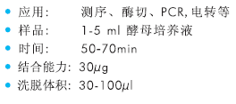 該試劑盒把硅膠柱純化技術同經典的SDS堿裂解法結合起來,用戶可在1小時內從酵母培養(yǎng)液中純化出高純度的質粒DNA。純化過程不需用任何到有害的有機物抽提,亦不需用到耗時的乙醇沉淀。質粒DNA的產量依賴于酵母攜帶質粒的拷貝數,酵母菌株以及生長條件。