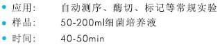 大提試劑盒適合于從50-250ml細(xì)菌培養(yǎng)液中純化大分子量的質(zhì)粒載體,或各種BAC,PAC,粘粒,Cosmid等載體。 純化的質(zhì)??芍苯佑糜诖笃螠y(cè)序,酶切,PCR,文庫(kù)制備等應(yīng)用。細(xì)菌收集后,加入Buffer T1/T2裂解,再加入Buffer T3離心沉淀去除蛋白質(zhì)和染色體DNA,在得到的上清液中加入獨(dú)特的結(jié)合液并轉(zhuǎn)移至結(jié)合柱進(jìn)一步去除蛋白質(zhì),經(jīng)過(guò)簡(jiǎn)單的兩次洗滌即可得到高純度的BAC/PAC/P1等大片段質(zhì)粒DNA。