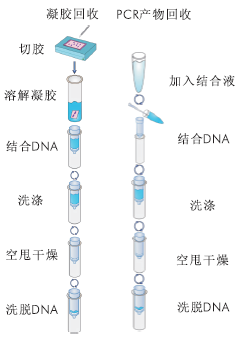 該試劑盒包含兩套回收方案,如需從多個條帶中回收某一特定條帶,可采用膠回收步驟,需將目的DNA片段從瓊脂糖凝膠上切下,溶膠后再回收DNA片段。如只需從PCR產物或酶促反應液中回收純化DNA片段,可采用液相純化回收步驟。一個試劑盒滿足多種需求,簡單方便。同時,該試劑盒采用微量結合柱,最小洗脫體積可降低為10μl,適合微量DNA回收實驗。