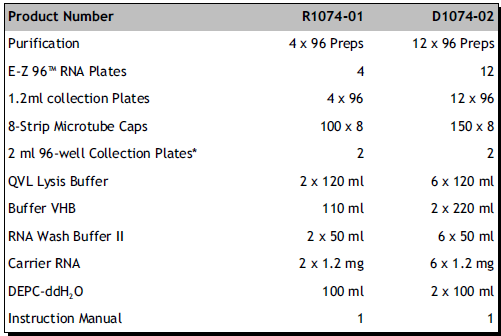基于 E.Z.N.A.® Viral RNA Kit(R6874)一樣的原理,該試劑盒專門設(shè)計(jì)高通量地從96個(gè)血清,無細(xì)胞體液或無細(xì)胞培養(yǎng)液提取病毒RNA。純化的RNA可直接用于各種下游應(yīng)用。